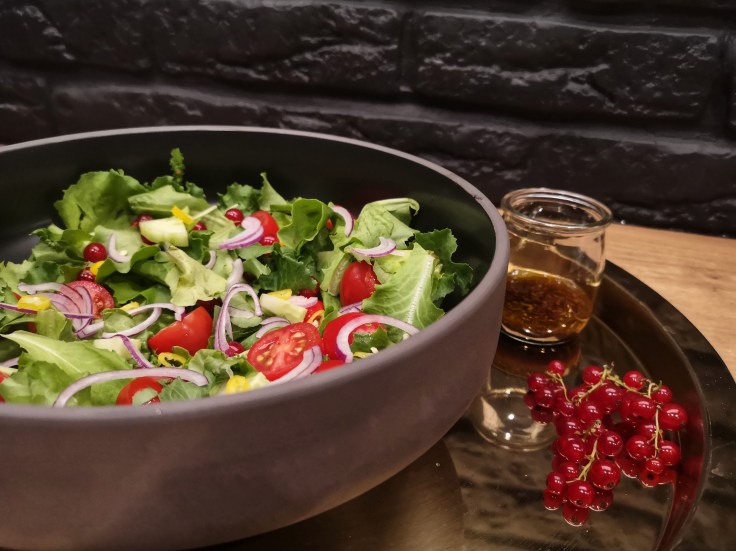 Idealna lekka sałatka, w sam raz na upały lub gdy mamy ochotę na coś fit. Czerwona porzeczka nadaje odświeżający, kwaskowaty smak oraz pięknie wygląda na talerzu 🙂
