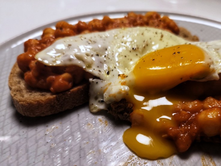 Wspaniała propozycja na sycące śniadanie lub kolację. Cieciorka duszona w pomidorach z ulubionym zestawem przypraw na chrupiącym toście z delikatnym jajkiem sadzonym.
