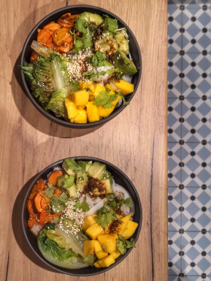 Wreszcie zabrałam się za jedno z przyjemniejszych dla oka dań – kolorowego bowla czyli miski pełnej pyszności. Z makaronem ryżowym i imbirowym dressingiem danie ma bardzo azjatycki charakter.