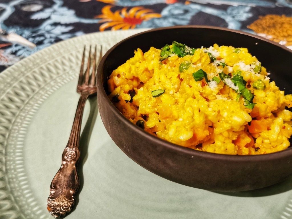 Pełne zdrowych warzyw, kolorowe risotto, które rozgrzeje was w chłodne dni. Jeśli użyjecie mrożonej dyni w kostce (ja użyłam Hortex) przygotowanie zajmie wam niedużo czasu. Jeśli macie świeżą dynię pokrójcie ją w kostkę, skropcie oliwą i pieczcie przez 25 minut w temperaturze 180°C. Przepis, z małymi modyfikacjami, ze strony bbcgoodfood.com.