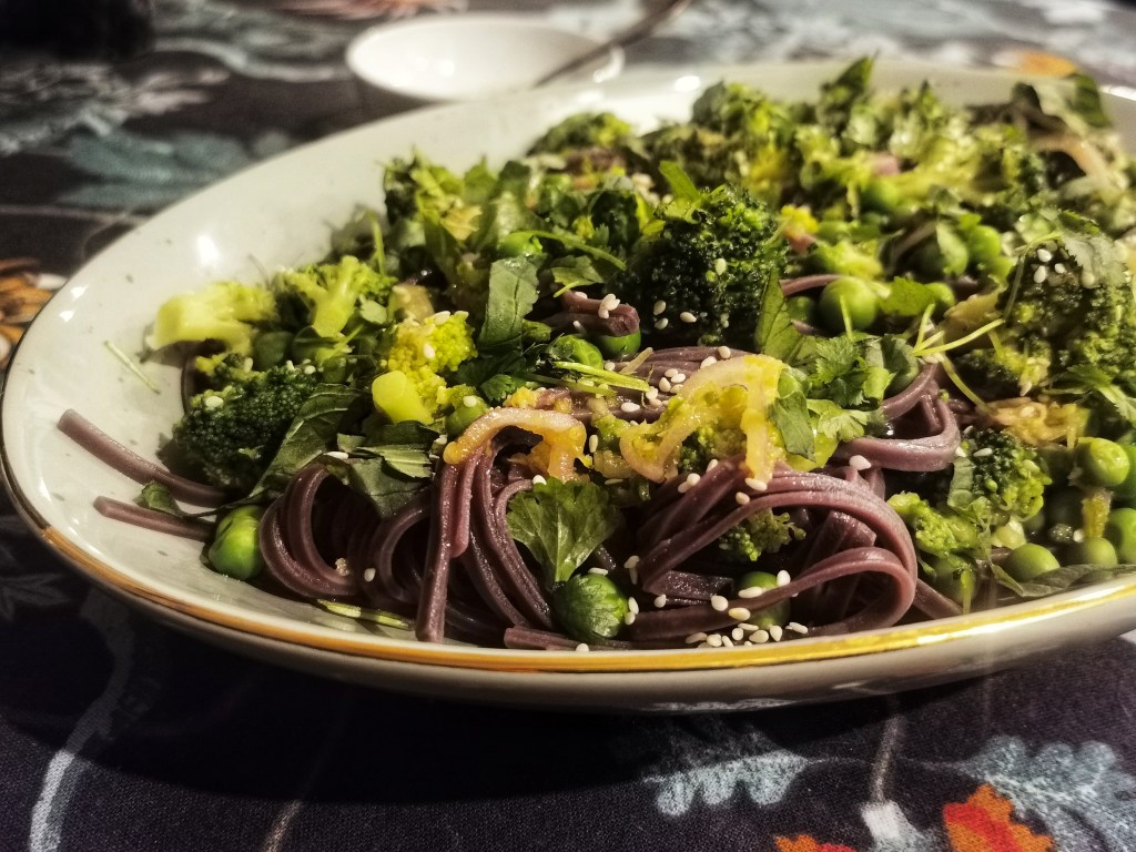 Na talerzu ułożyć makaron, warzywa, polać dressingiem, posypać posiekanymi ziołami i uprażonym sezamem.