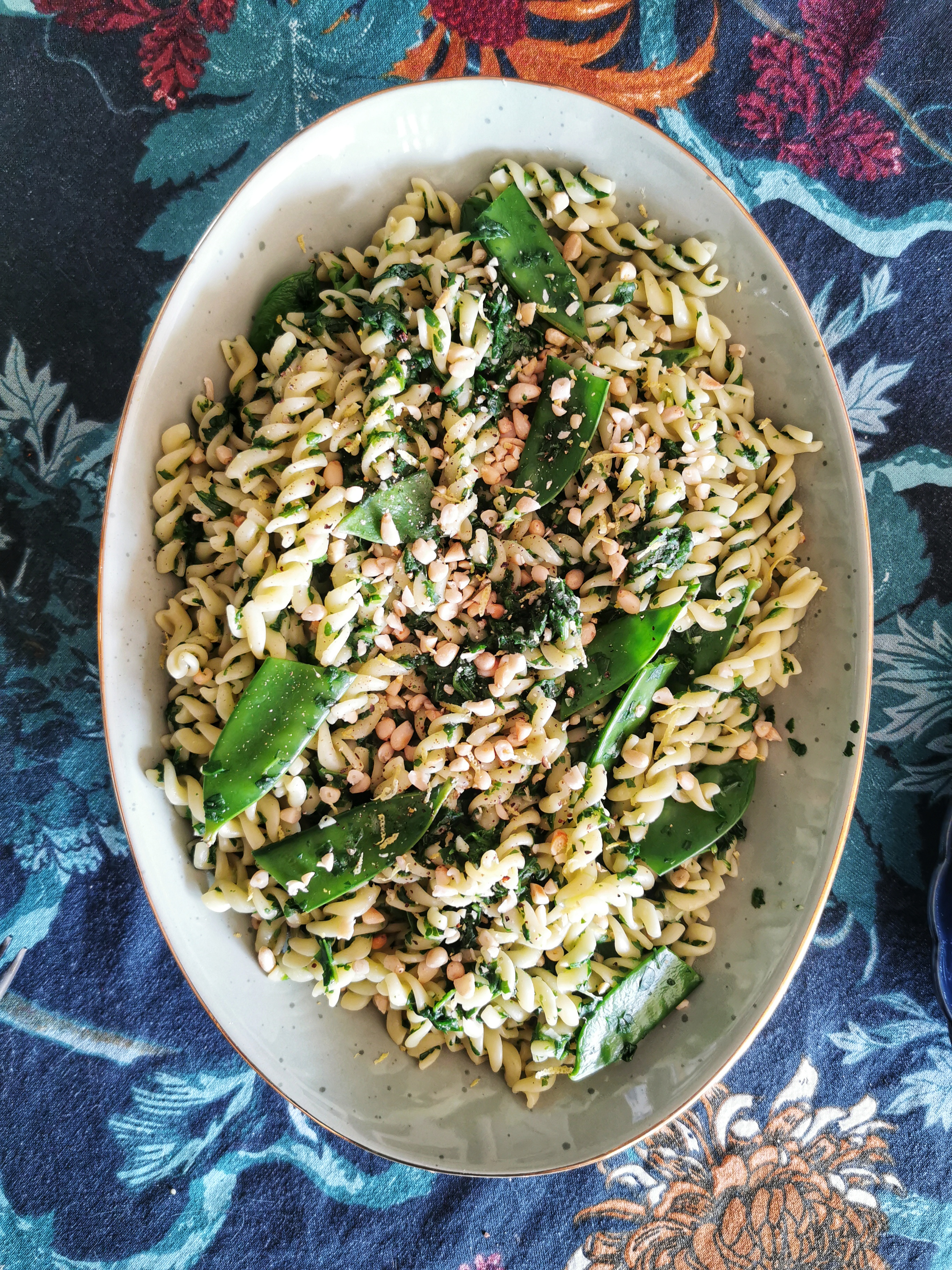 W garnku po makaronie lub na patelni rozgrzać oliwę, dodać sos szpinakowy i makaron z groszkiem. Chwilę razem podgrzewać, w razie potrzeby dodać odłożoną wodę z gotowania, żeby sos dokładnie pokrył makaron. Przyprawić solą i pieprzem, startą skórką cytrynową i podprażonymi i posiekanymi orzechami.