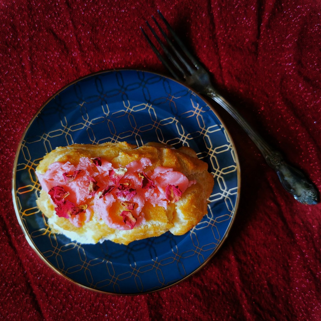 Ozdobić wierzch eklerki rozpuszczoną czekoladą i płatkami róży.