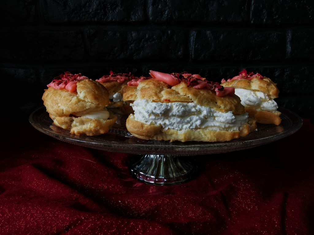 Na dolnej części eklerki rozsmarować konfiturę malinowa, nałożyć krem i przykryć górną częścią ciastka.
