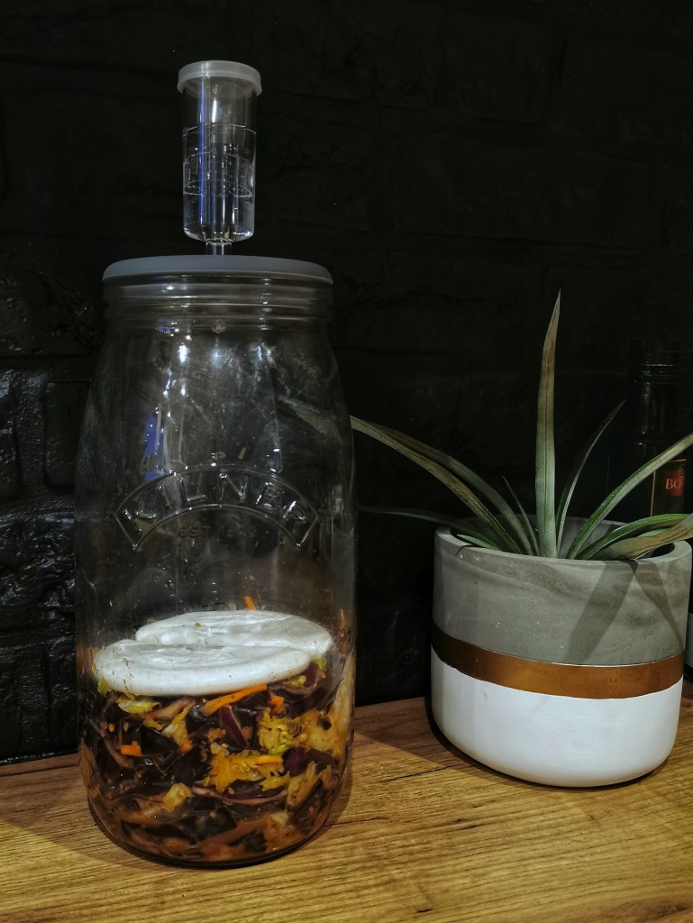 Kiedy kapusta będzie dobrze natarta przełożyć do słoika lub pojemnika do kiszenia, docisnąć, zamknąć i pozostawić w temperaturze pokojowej na 3 dni. Ja użyłam słoika do kiszenia Kilner.