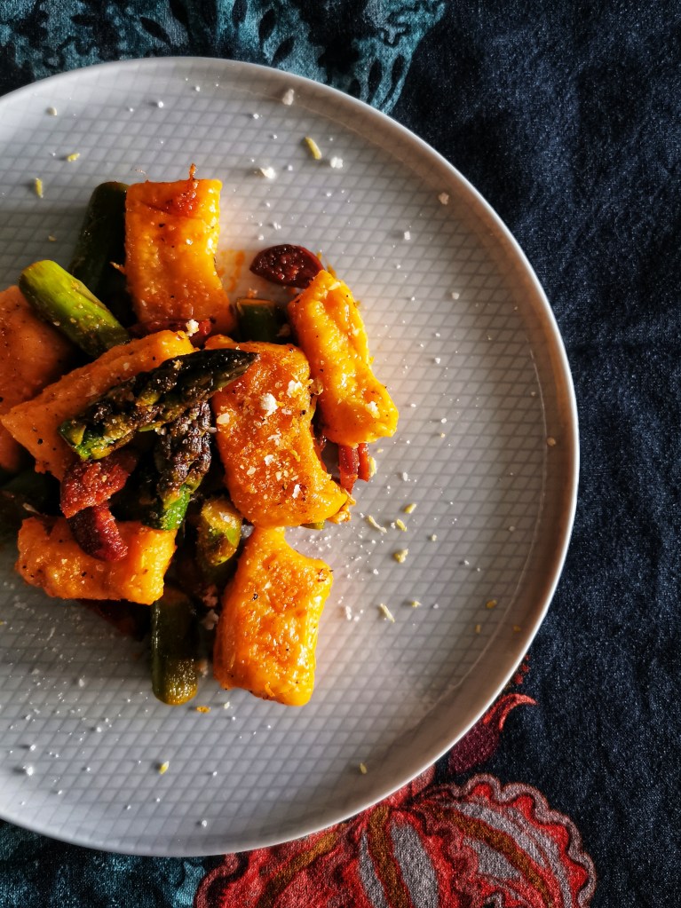 Gnocchi czy kopytka? Co kraj to nazwa, ale rozchodzi się o jedno – kluski przygotowane z ziemniaków i mąki. Ja bardziej niż ziemniaki lubię ich słodkich kuzynów – bataty, dlatego kluski przygotowałam właśnie z nich. Na pewno trzeba dodać więcej mąki, bo bataty mają luźniejszą, bardziej wilgotną konsystencję.