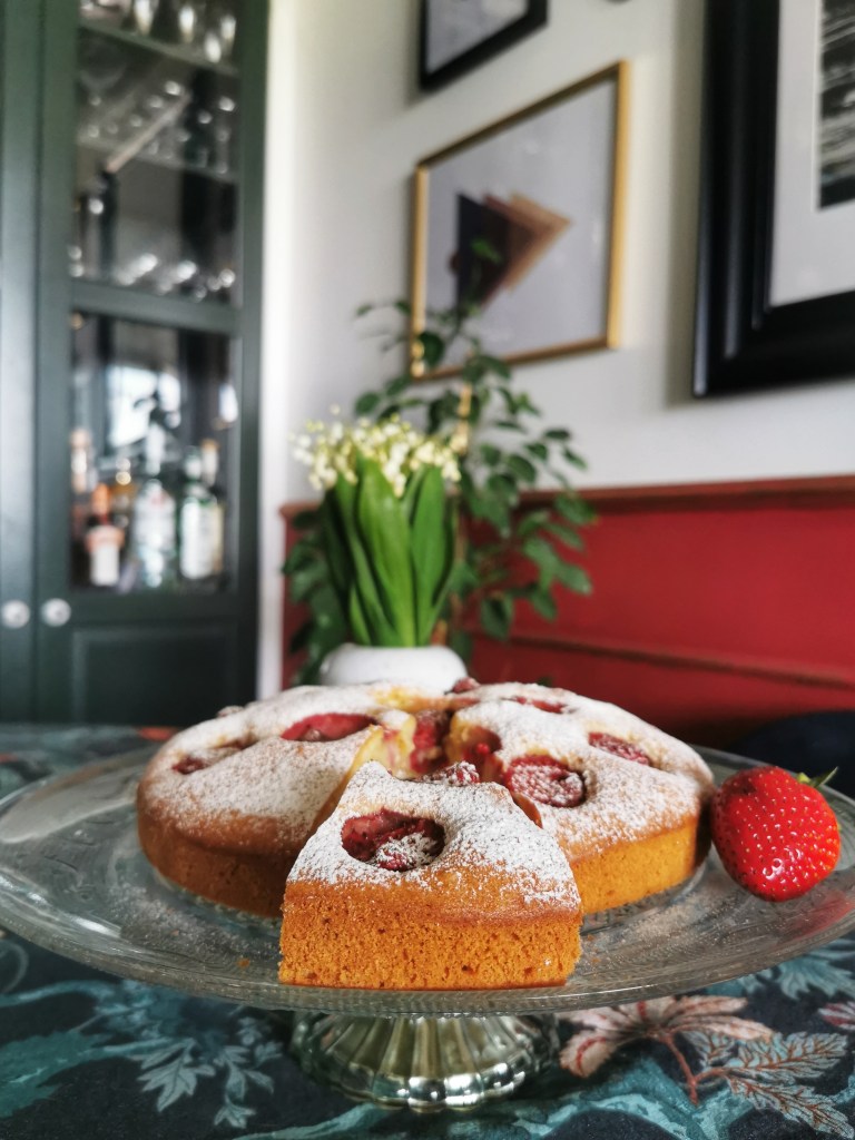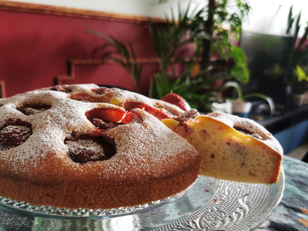 Przepis zapożyczony od Moich Wypieków – delikatne ciasto, do którego pasują nie tylko truskawki. Można też użyć mrożonych owoców (nie rozmrażamy ich wcześniej). Mimo oddzielnego ubijania białek robi się prosto i szybko i praktycznie w jednej misce.