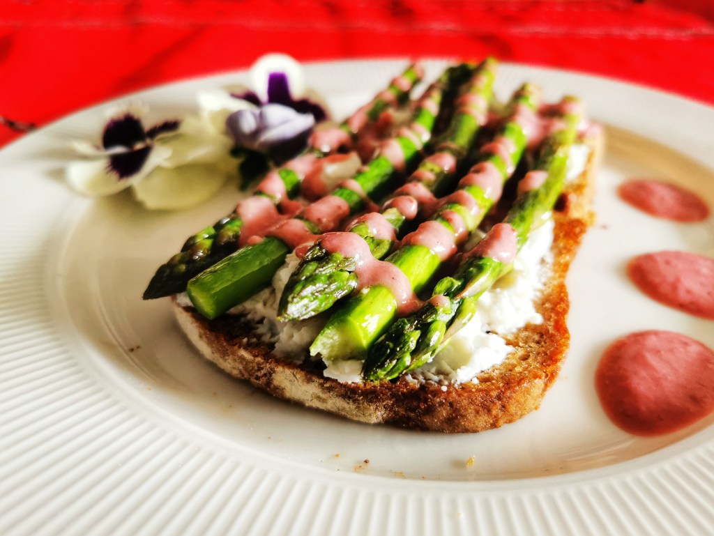 Kolejny przepis z serii śniadanie mistrzów. W sam raz na niezbyt długi moment kiedy szparagi jeszcze się nie skończyły a truskawki już zaczęły. Moje tosty są z żytniego chleba, ale możecie zastąpić innym ulubionym.