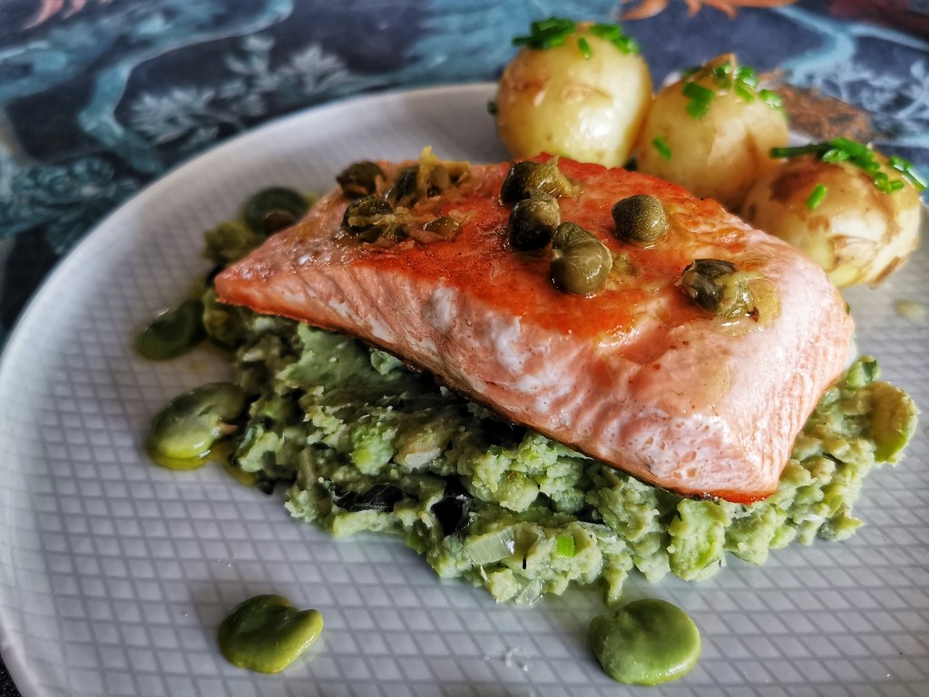 Kolejne wcielenie bobu i kolejny mariaż z łososiem – tym razem do tego duetu dołączyły młode ziemniaki. Dodatek świeżych ziół i lekko kwaskowatego dressingu to wisienka na torcie.
