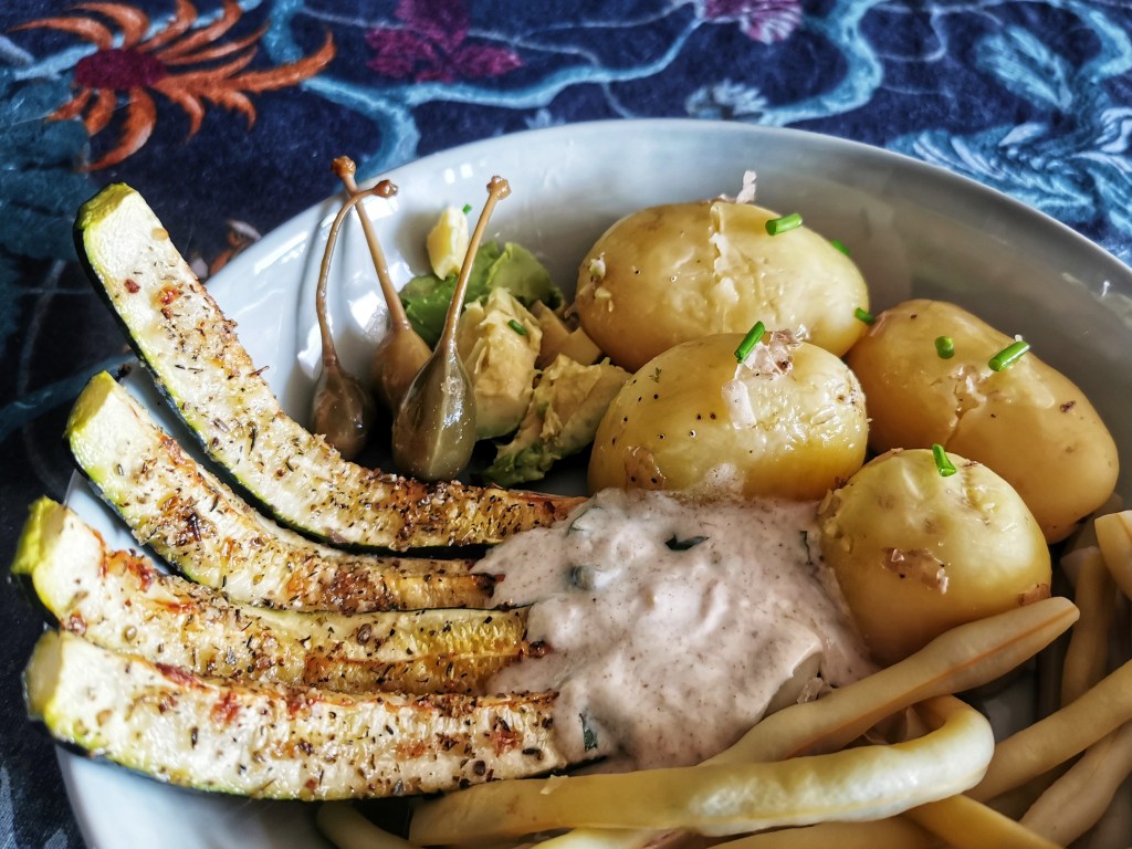 W misce ułożyć ziemniaki polane masłem (lub oliwą) i posypane szczypiorkiem, obok fasolkę, awokado, paluszki z cukinii i jabłuszka kaparowe. Nałożyć jogurtowy dressing i podawać.