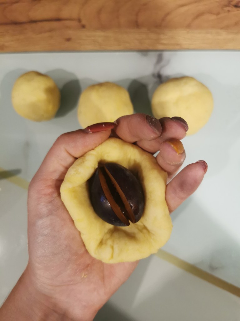 Odrywać kawałki ciasta (ok 3 x 3 cm). Z każdego uformować kulkę, rozpłaszczyć na cienki placuszek, wsadzić śliwkę i zlepić brzegi. Porolować chwilę w dłoniach, żeby uformować zgrabną kulkę. Odłożyć na deskę lub talerz i to samo zrobić z resztą ciasta.