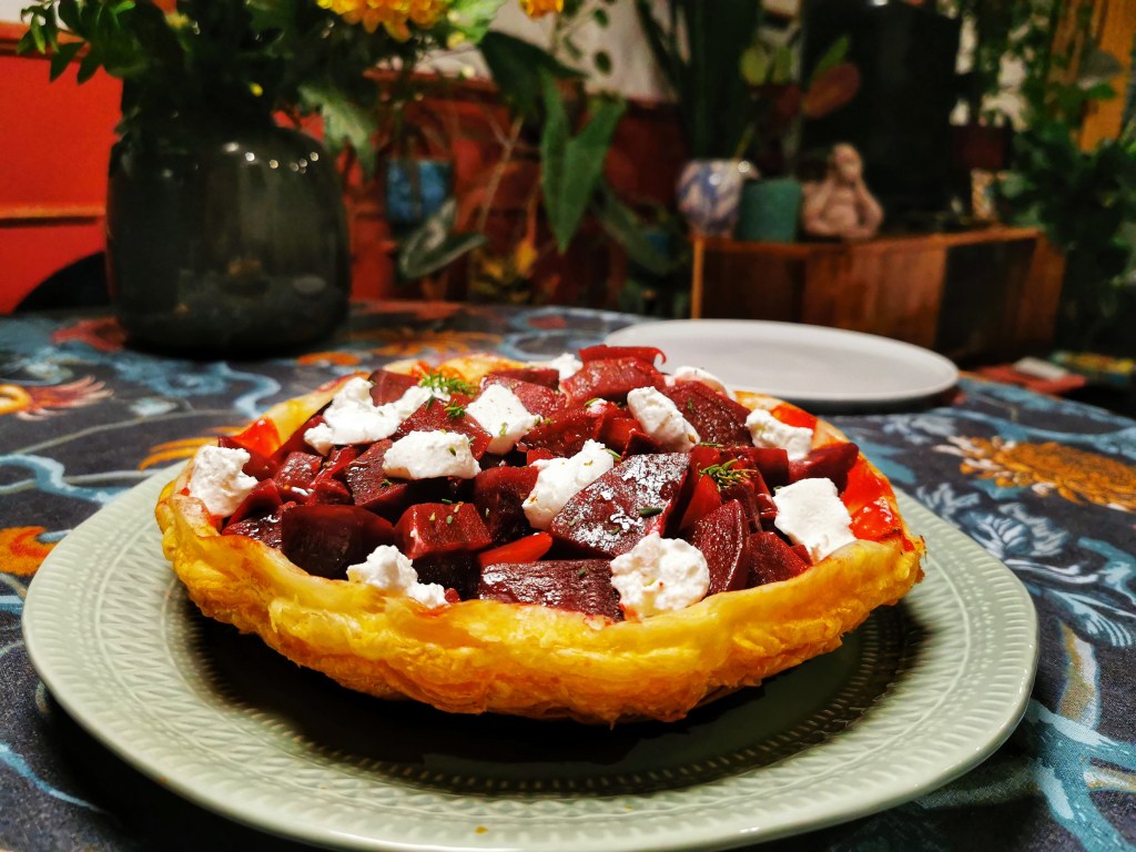 Buraki i kozi ser to ponadczasowe połączenie. Sprawdza się w zupach, przekąskach i daniach głównych. Tym razem wykorzystałam do zrobienia ciepłej kolacji – prostej odwróconej tarty na bazie gotowego ciasta francuskiego.