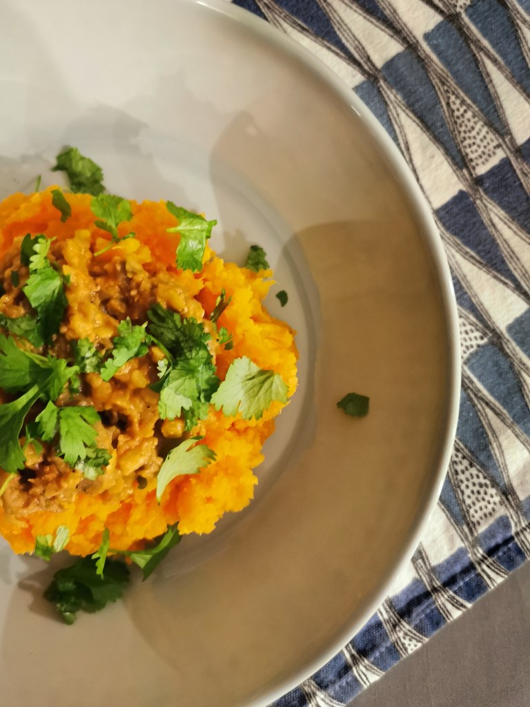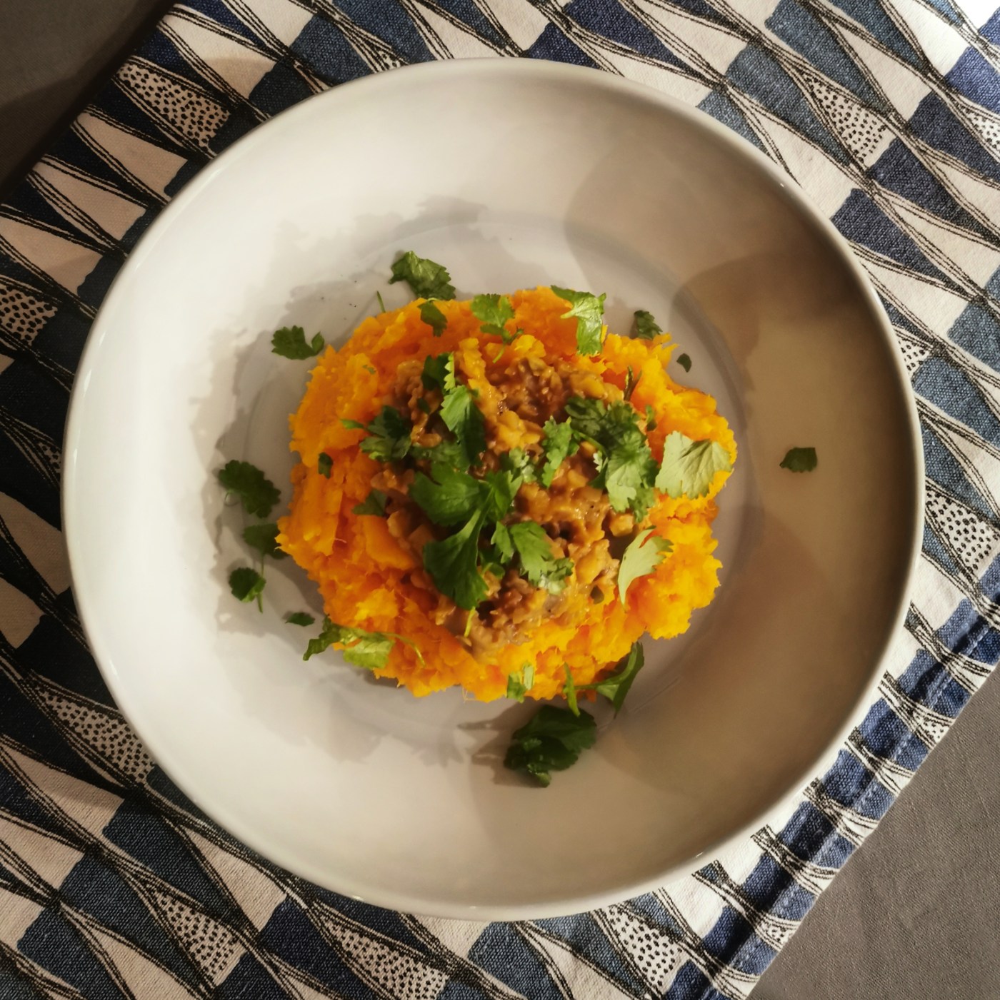 Na talerz nałożyć puree z batatów a na wierzch gulasz warzywny. Posypać ulubionymi ziołami (u mnie kolendra).