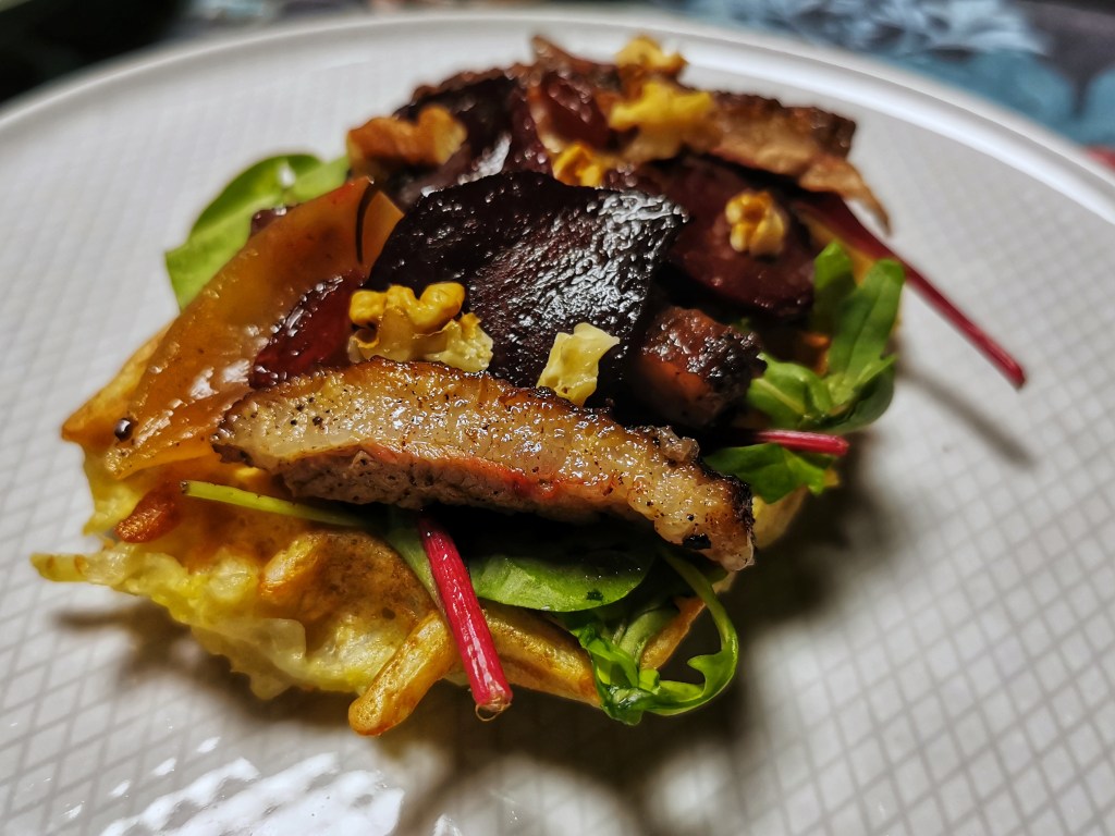 Na talerzach układać gofry, na nich listki, kawałki gęsiny, plasterki buraków i posypać orzechami.