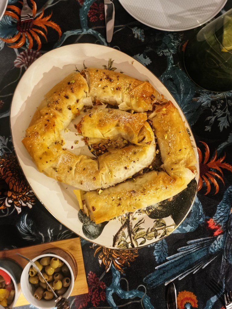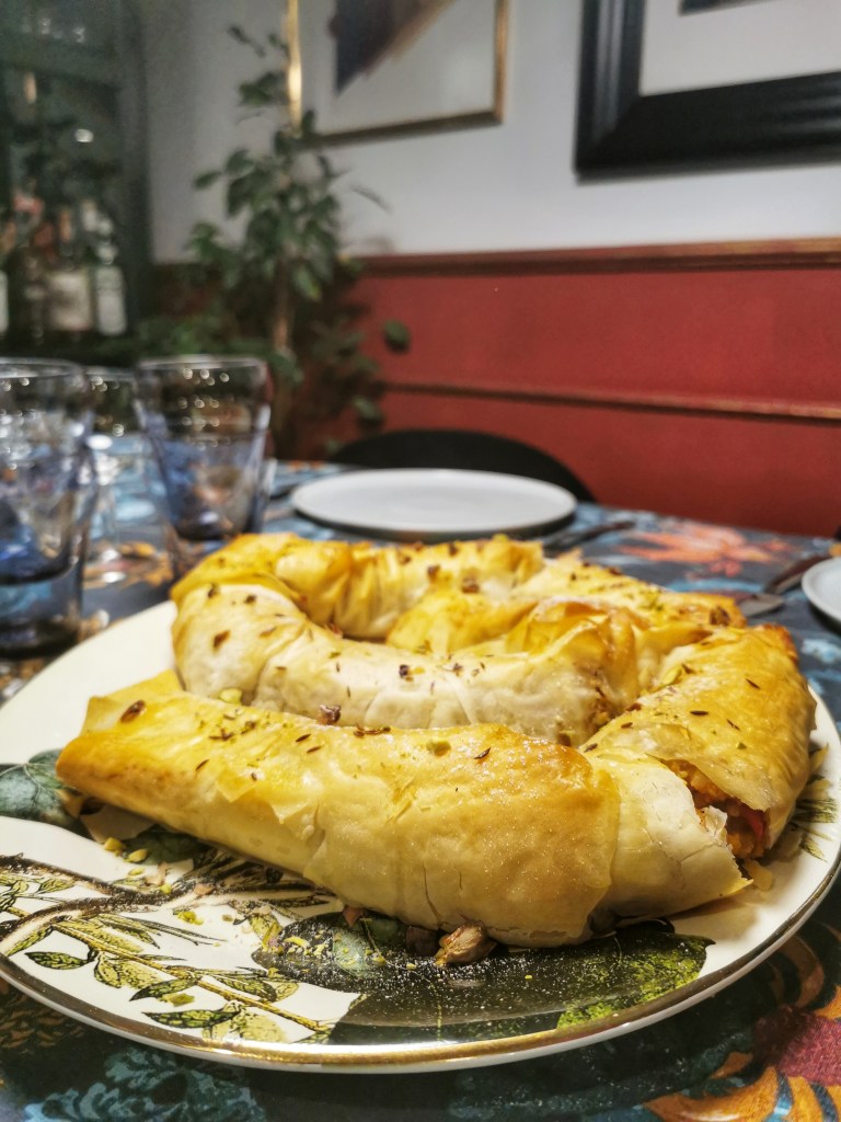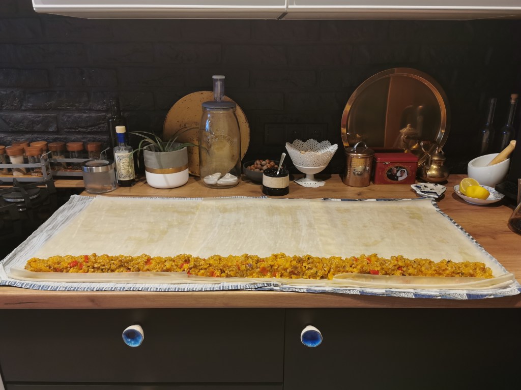 Kolejne danie ze świątecznej książki kucharskiej Jamiego Olivera. Marokańska m’hanncha czyli mega długa rolada z ciasta filo, często nazywana wąż lub ślimak, że względu na swój kształt. Zazwyczaj nadziewana słodkim nadzieniem, w tej odsłonie z farszem z kaszy, dyni, czerwonej papryki, suszonych owoców i aromatycznych przypraw. Ciasto filo kupiłam gotowe (tak samo zawsze robię z ciastem francuskim). Najłatwiej je dostać w sklepach z orientalną żywnością, ale też w dużych marketach (ja upolowałam w Kauflandzie). Uwaga: rolowanie najlepiej robić na 4 ręce.