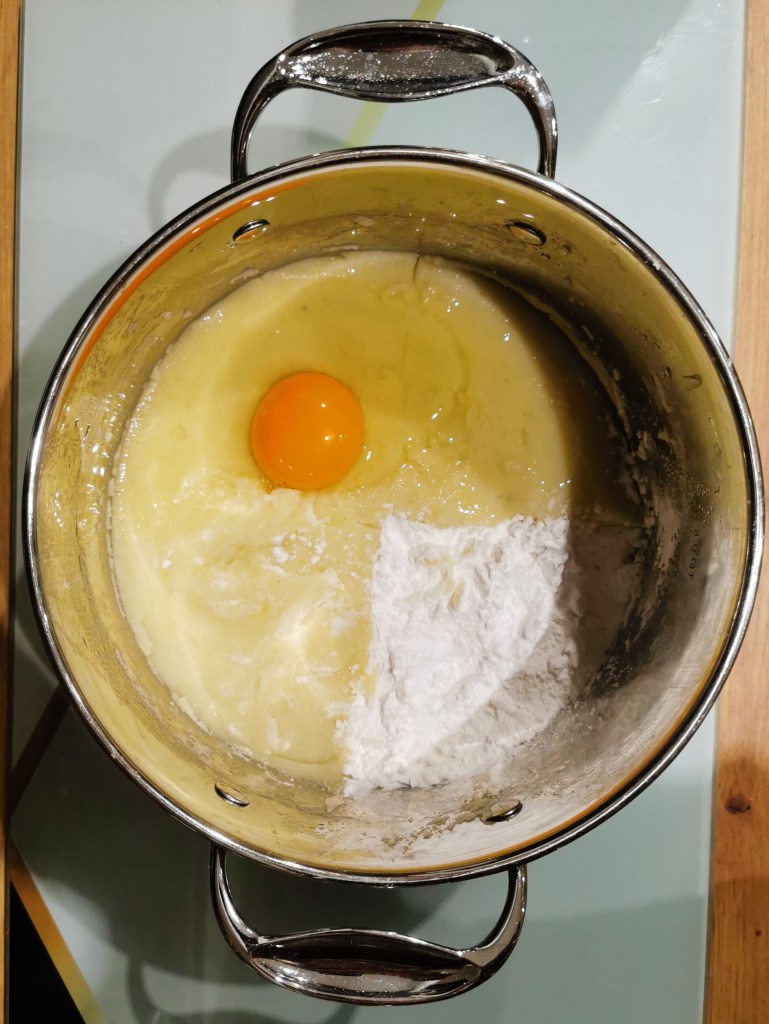 Ugotowane, jeszcze ciepłe ziemniaki przecisnąć przez praskę lub przepuścić przez maszynkę do mielenia (drobne oczka). Zostawić do odparowania i wystudzenia. Ubić w misce lub garnku na równą warstwę i wyjąć 1/4 ziemniaków (odłożyć na bok). W to miejsce wsypać mąkę ziemniaczaną (wyjdzie ok 200-250 g), dodać jajko, sól i odłożoną resztę ziemniaków.