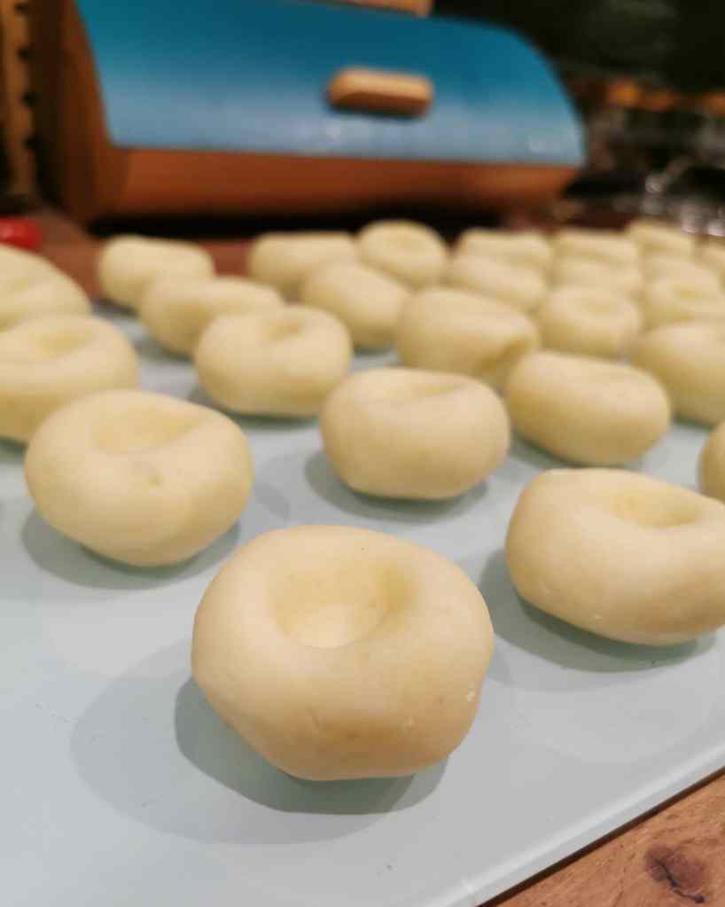 Zagnieść gładkie ciasto. Odrywać kawałki wielkości orzecha włoskiego, toczyć kulki i palcem robić wgłębienia.