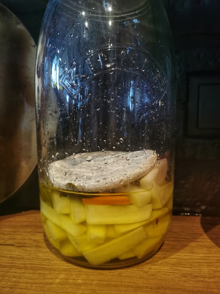 Marynowana biała rzodkiew zawdzięcza swój słoneczny kolor kurkumie – suszonej lub świeżej. Używana w kuchni azjatyckiej, występuje pod nazwami Oshinko, Takuan lub Danmuji. Jest bardzo prosta do przygotowania i stanowi świetną przegryzkę między daniami. Inspiracją był przepis z bloga Pyza made in Poland.