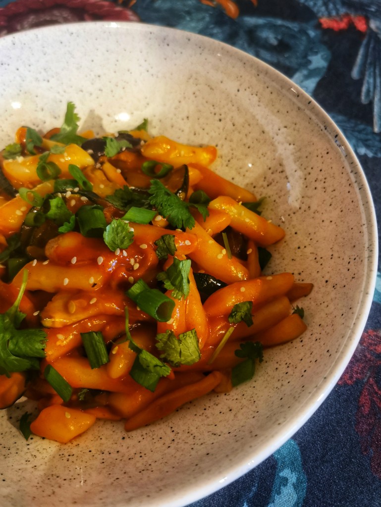Tteokbokki to danie wywodzące się z ulicznej kuchni koreańskiej. Kluski ryżowe, które trochę można porównać do naszych kopytek, najczęściej występują pod nazwą rice cake. Można je kupić w sklepach z azjatycką żywnością. Najczęściej podaje się je w pikantny sosie na bazie pasty gochujang choć popularne są też w delikatnym sosie na bazie sosu sojowego. Moja wersja jest mega uproszczona (oryginalnie gotuje się kluski w specjalnym wywarze, który przerobiłam wg zawartości swojej spiżarni). Tak samo postąpiłam z dodatkami do klusek – cukinia i grzyby shimeji to totalnie moja wariacja na temat 😉