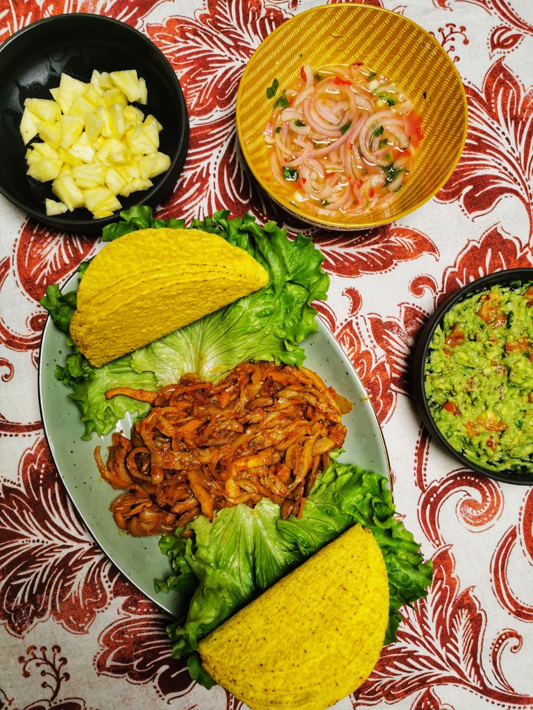 Meksykańskie smaki – kukurydziane taco z pikantnymi boczniakami, marynowaną cebulą, ananasem i guacamole. Inspiracją był przepis z bloga alemeksyk.pl