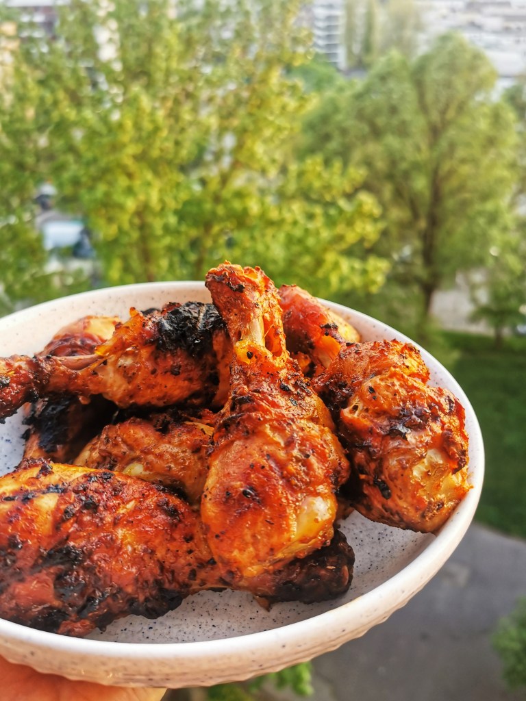 Delikatne mięso z kurczaka w aromatycznej marynacie wg przepisu z książki kucharskiej Webera. Użyłam podudzi, w oryginale są to szaszłyki z udek – w mojej wersji trzeba mięso dłużej trzymać na grillu, żeby się zrobiło przy kości.