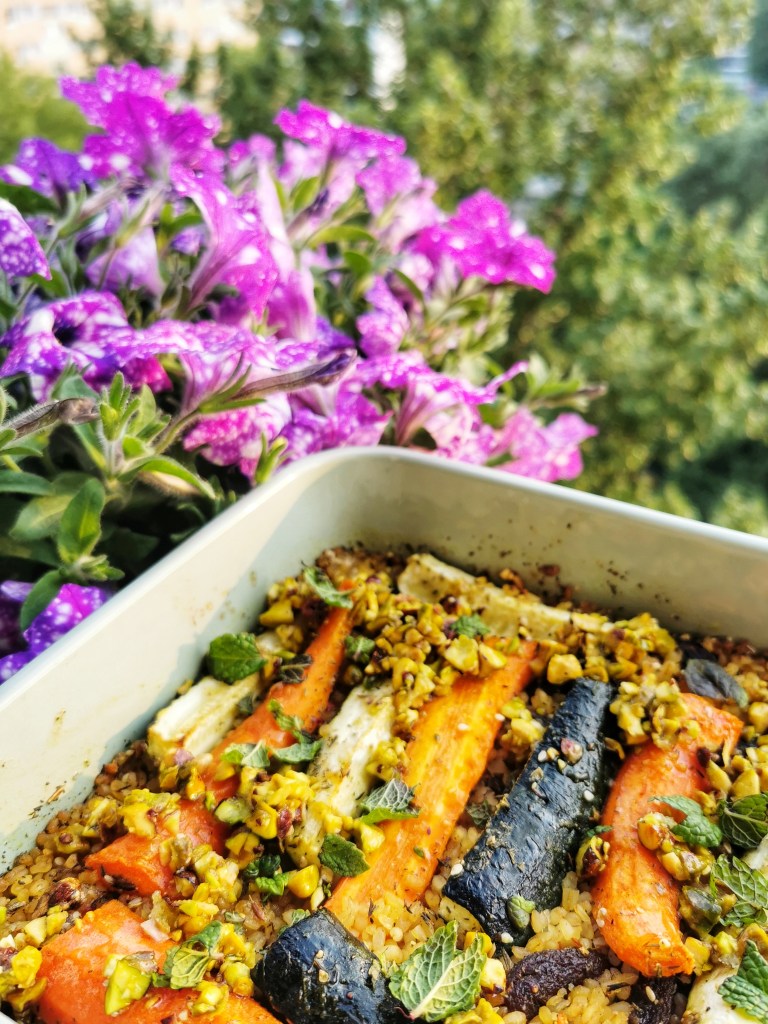 Niesamowita mieszanka smaków, aromatów i konsystencji. Zapiekane w jednym naczyniu kasza bulgur ze słodkimi suszonymi morelami, aromatyczną przyprawą za’atar i młodymi warzywami. Wszystko posypane pistacjami i miętą. Można podawać jako samodzielne danie lub dodatek do dania głównego.