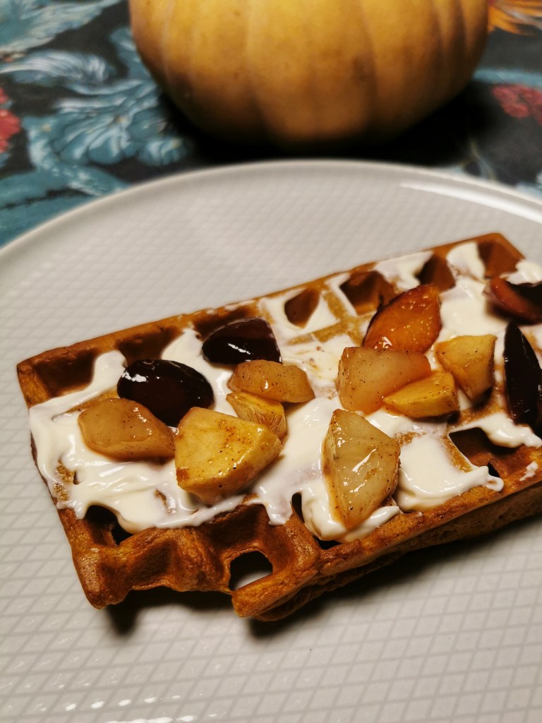 Idealny jesienny deser – gofry z dodatkiem puree z dyni, kremowa ricotta z pomarańczowym aromatem i pieczone jesienne owoce. W sam raz na weekendowe śniadanie, podwieczorek lub kolację.