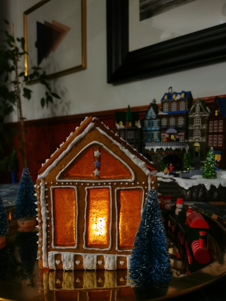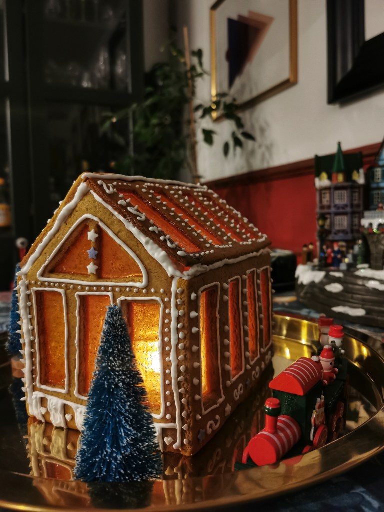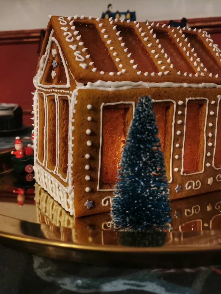 W tym roku oprócz pierniczków (Pepparkakor) zaszaleliśmy i zrobiliśmy domek z piernika, a dokładniej piernikową szklarnię, do której wycięcia udało mi się dorwać zestaw foremek. W internecie krąży mnóstwo szablonów do wycinania piernikowych chatek więc nie trzeba koniecznie posiadać foremek. W załączonej do zestawu instrukcji okna były wypełnione żelatyną w listkach, przyklejoną na lukier, ja użyłam pokruszonych landrynek, które po rozpuszczeniu w piekarniku utworzyły piękne witraże. Przepis na ciasto do domku z piernika pochodzi ze strony mojewypieki.com – jest to oszczędnościowa wersja ponieważ chatka ma służyć tylko do dekoracji. Z tych proporcji wyszły mi dwie szklarnie, ale dużo ciasta odzyskiwałam z wycinania okien, standardowy domek z piernika powinien wyjść jeden.