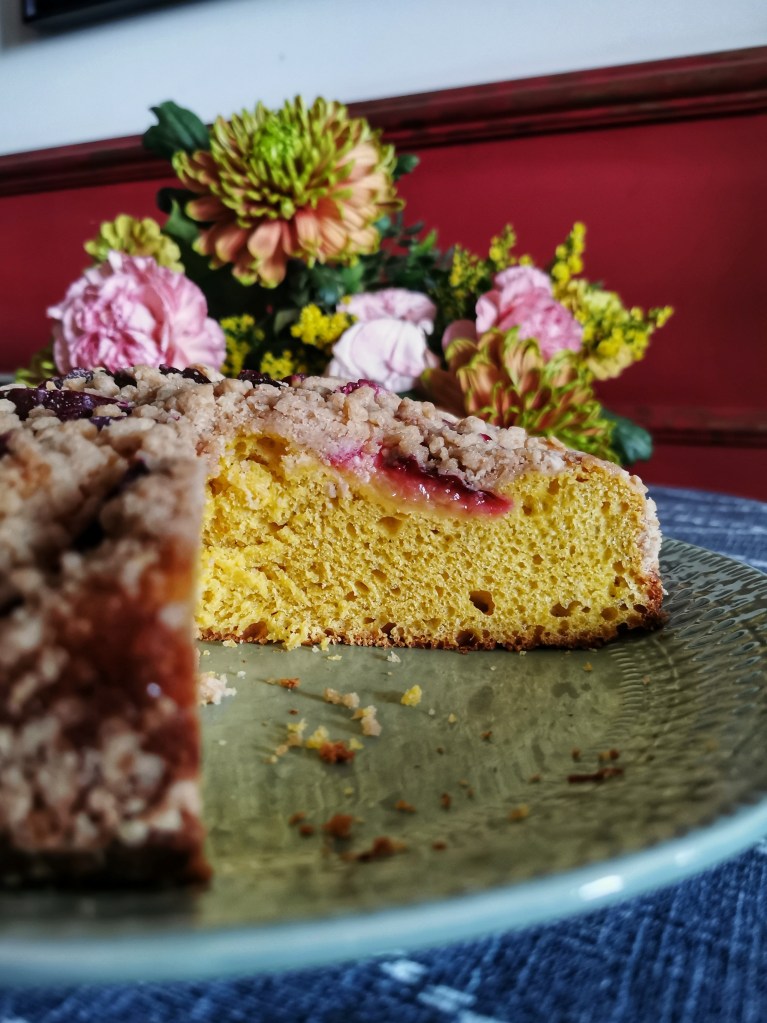 Puszyste drożdżowe ciasto o pięknym, złocistym kolorze, który nadaje dynia. Ze słodką, cynamonową kruszonką i śliwkami.