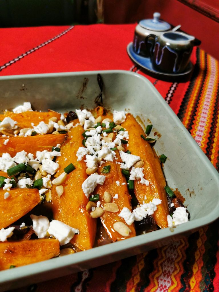 Wyjąć bataty z piekarnika, polać dressingiem, posypać pokruszoną fetą, orzeszkami ziemnymi i posiekaną dymką.