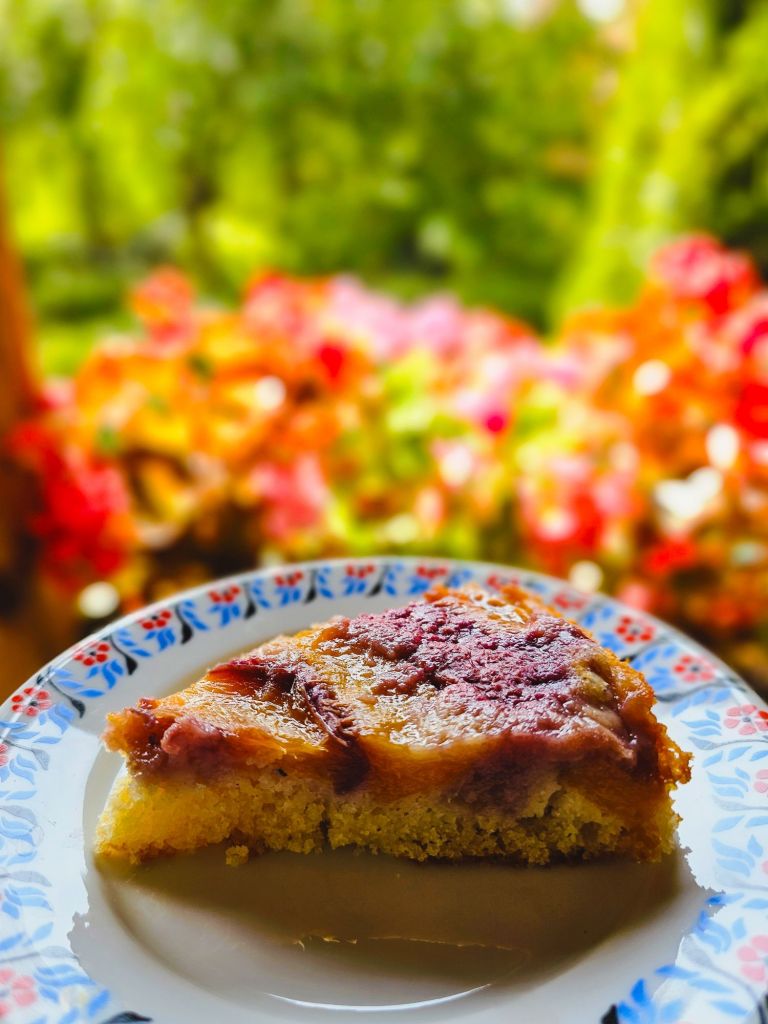 Wylać ciasto na owoce i wstawić do piekarnika nagrzanego do 170°C (u mnie dolny poziom, grzałki góra i dół, bez termoobiegu). Piec około 40 minut lub tzw. suchego patyczka. Wyjąć z piekarnika, wystudzić, przełożyć na talerz lub paterę odwracając do góry nogami.