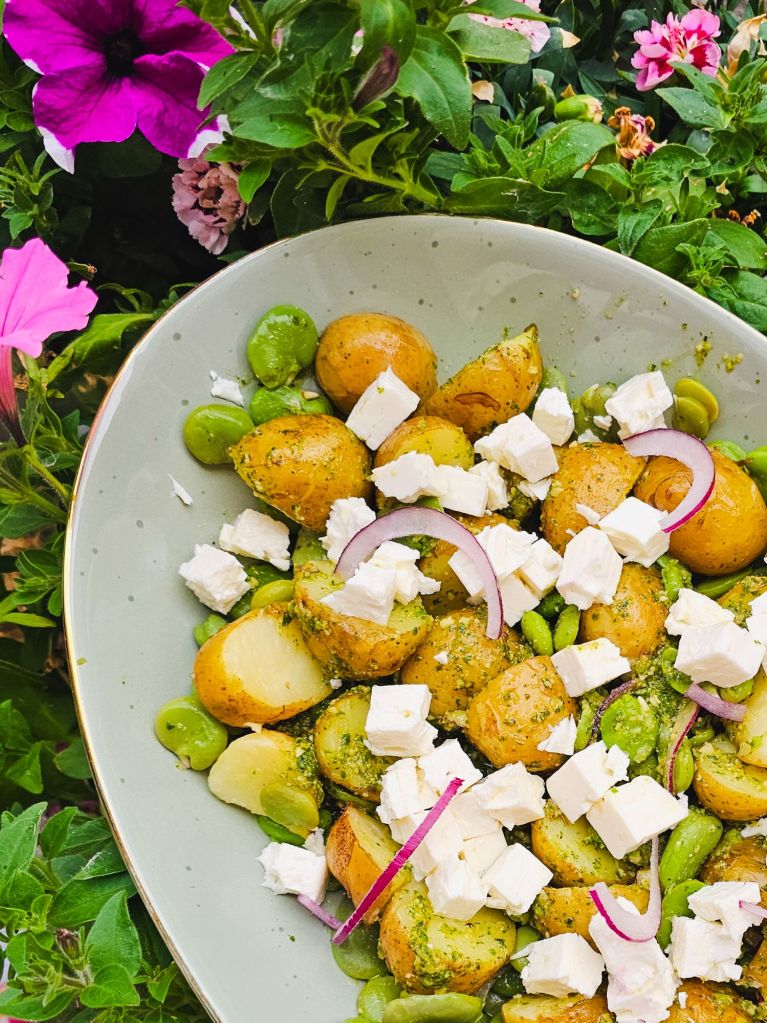 Kolejna sałatka z młodymi ziemniakami w roli głównej – tym razem z polską pistacją, czyli bobem, i kremową fetą. Można podawać osobno lub jako dodatek do dania (u mnie w towarzystwie pieczonego łososia). Inspiracją jest przepis Rozkosznego, z małymi modyfikacjami.