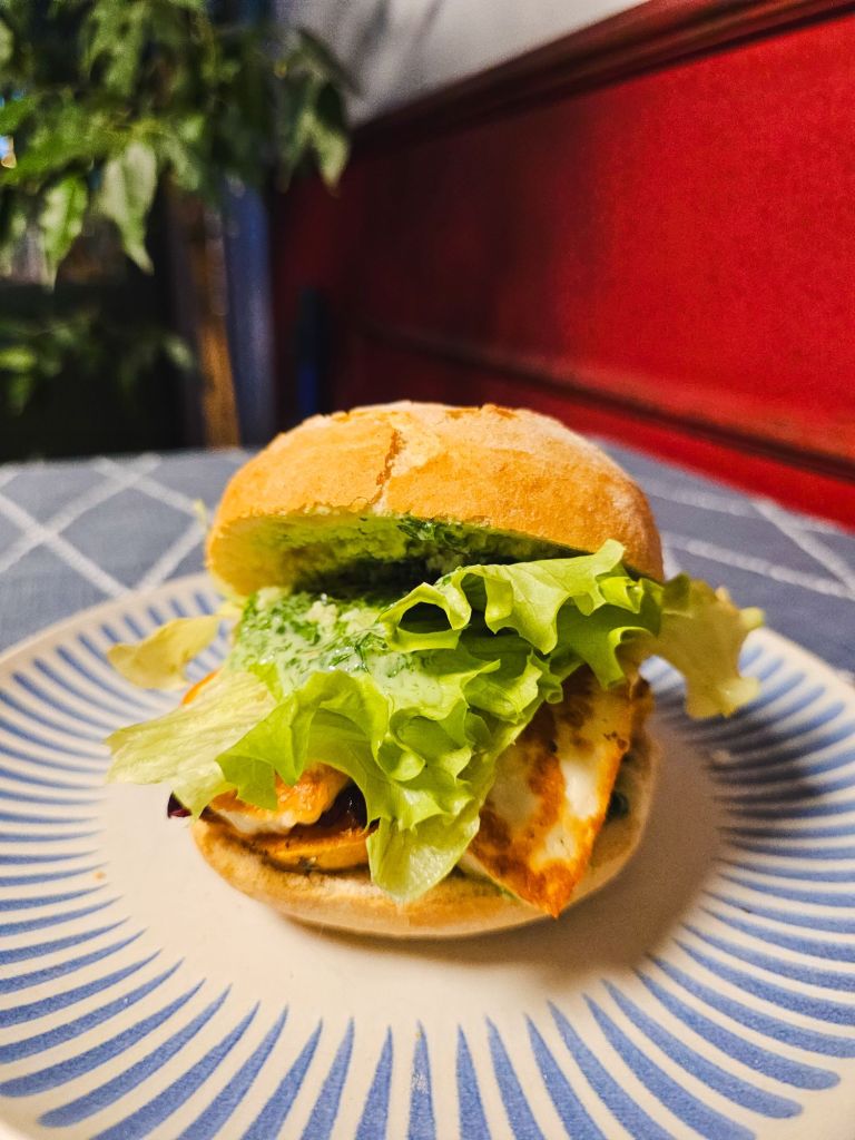 Kanapka – sztos. Trochę jak wege burger. Z pieczonymi plastrami batata, zrumienionym haloumi, ziołowym sosem i karmelizowaną cebulą. Mój sos jest na bazie czosnku niedźwiedziego i mięty, ale możecie użyć innych świeżych ziół.