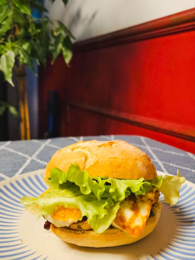 Gdy batat sos upiecze (będzie miękki) wyjąć naczynie z piekarnika i zostawić do lekkiego ostygnięcia. Pokroić haloumi na około 1 cm plastry (po 2 na każdą kanapkę) i usmażyć na złoto na patelni. Około 2 minuty z każdej strony.